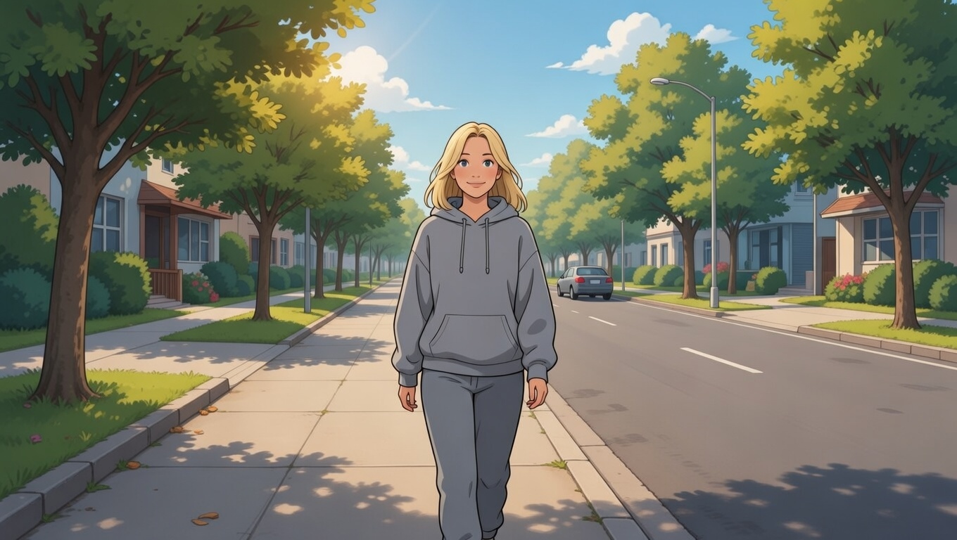 Shadowy illustration of a blonde woman in sweatpants and hoodie walking down a quiet street, feeling both free and exposed